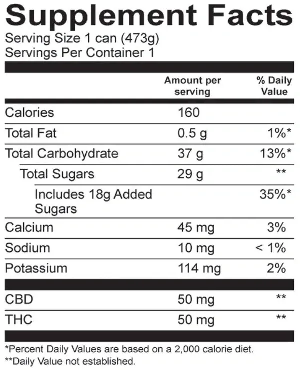 NOTICE: this is a very potent product. One can contains a full 50mg THC. An average serving of THC is 5-10mg, so If you are new to THC, start slow with 1/10th of a can and work your way up.